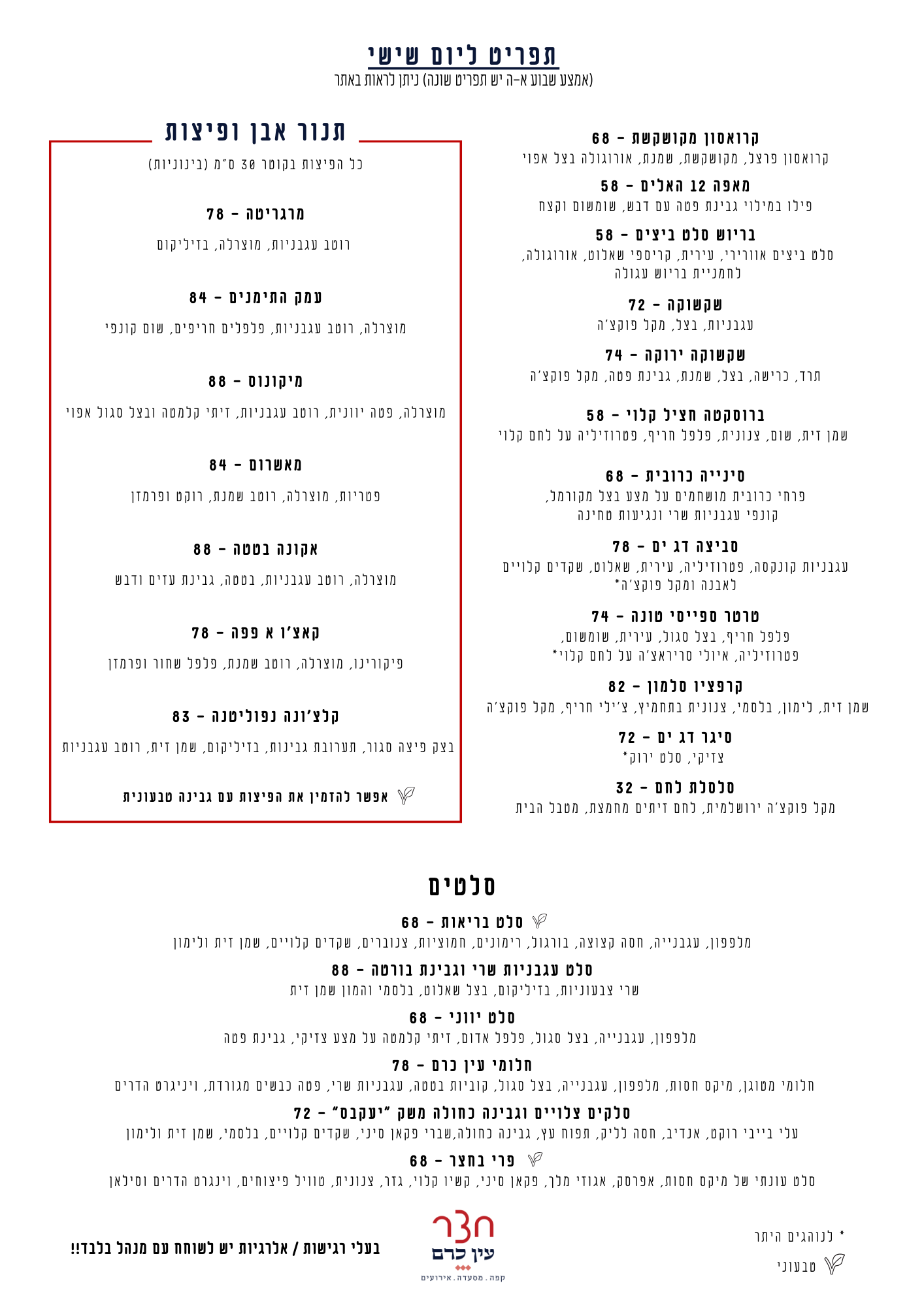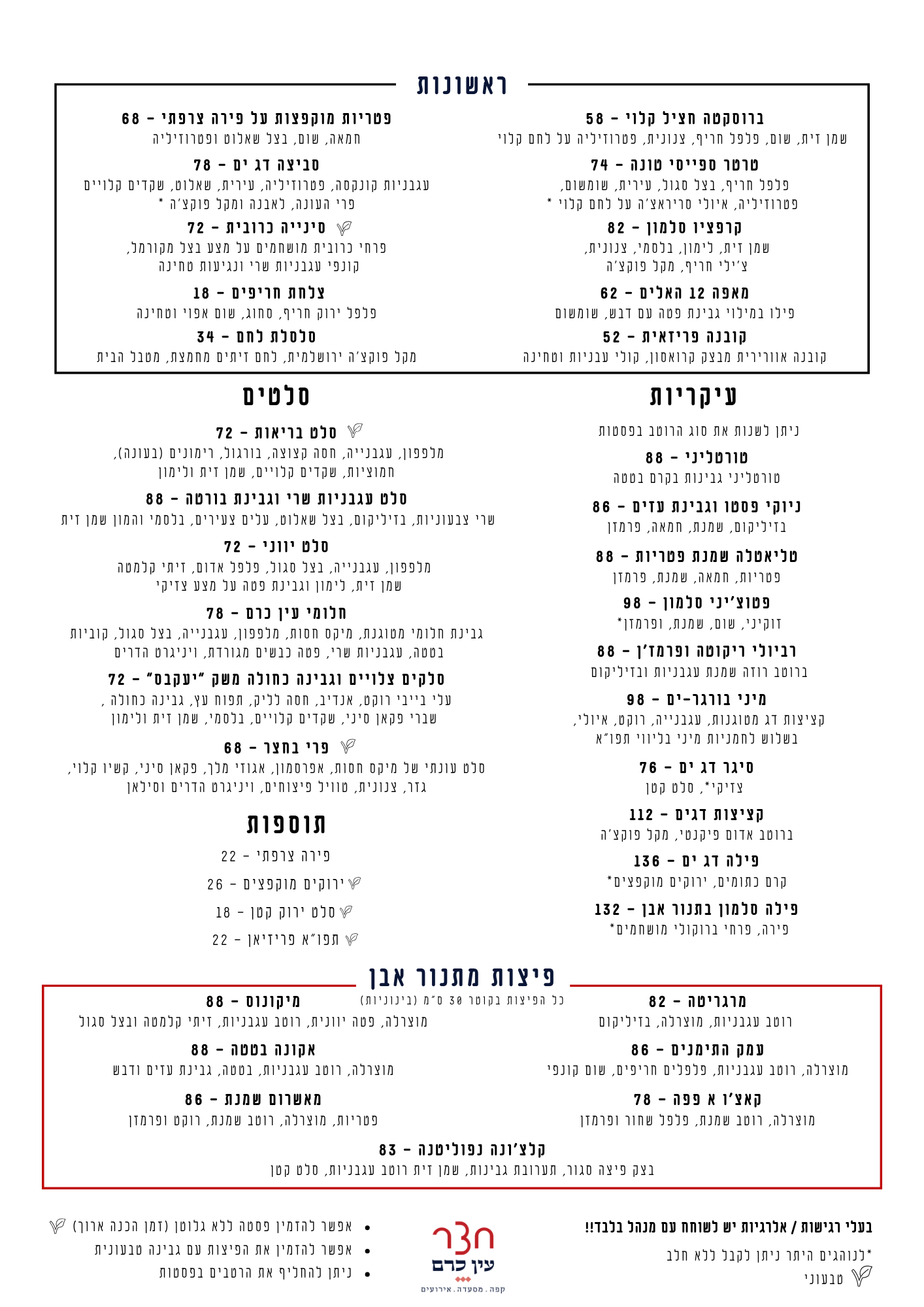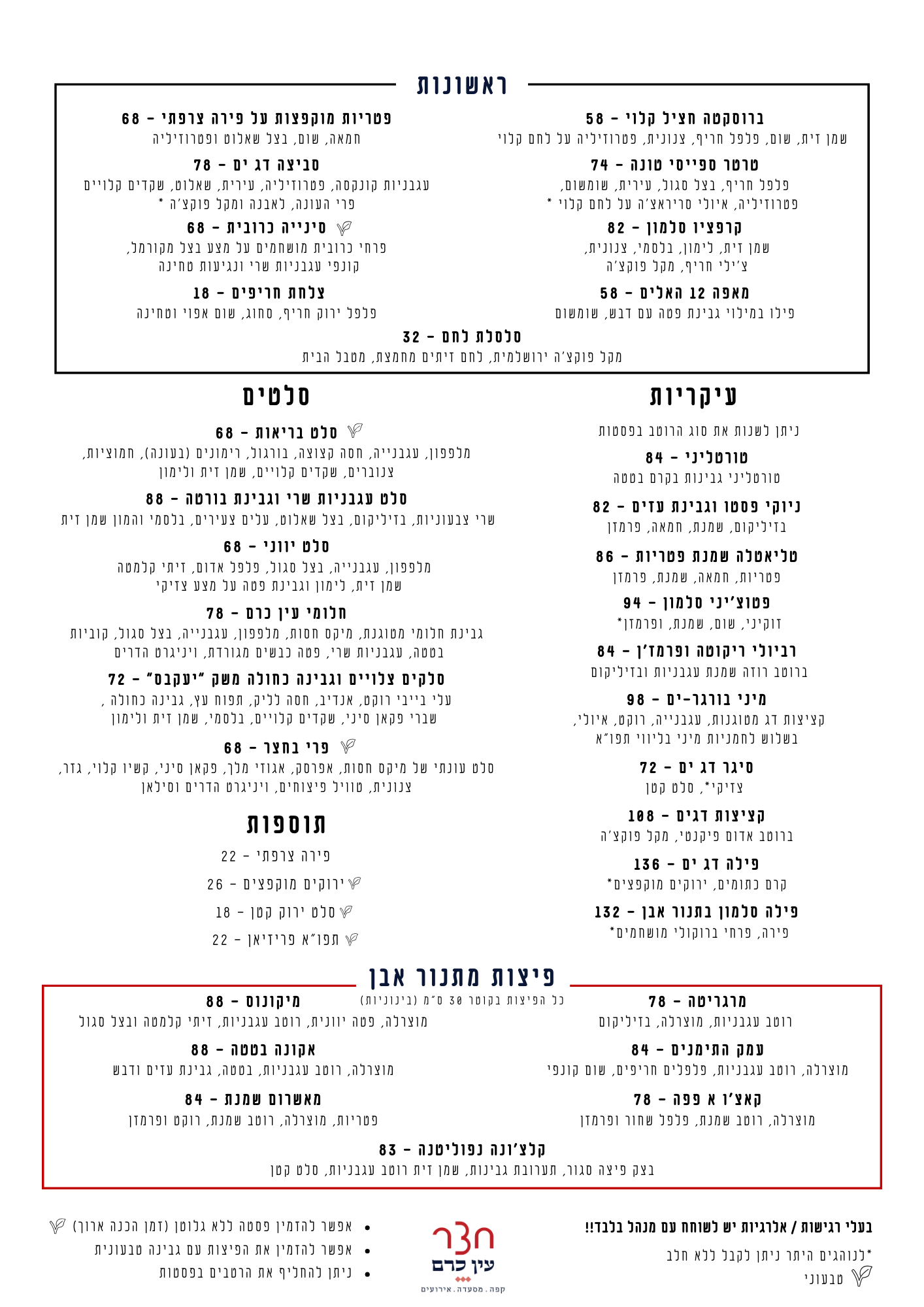 יש הרבה מנות ללא גלוטן בתפריט ותמיד אנחנו שמחים לעזור ולהתאים את התפריט במידת הצורך לאורח