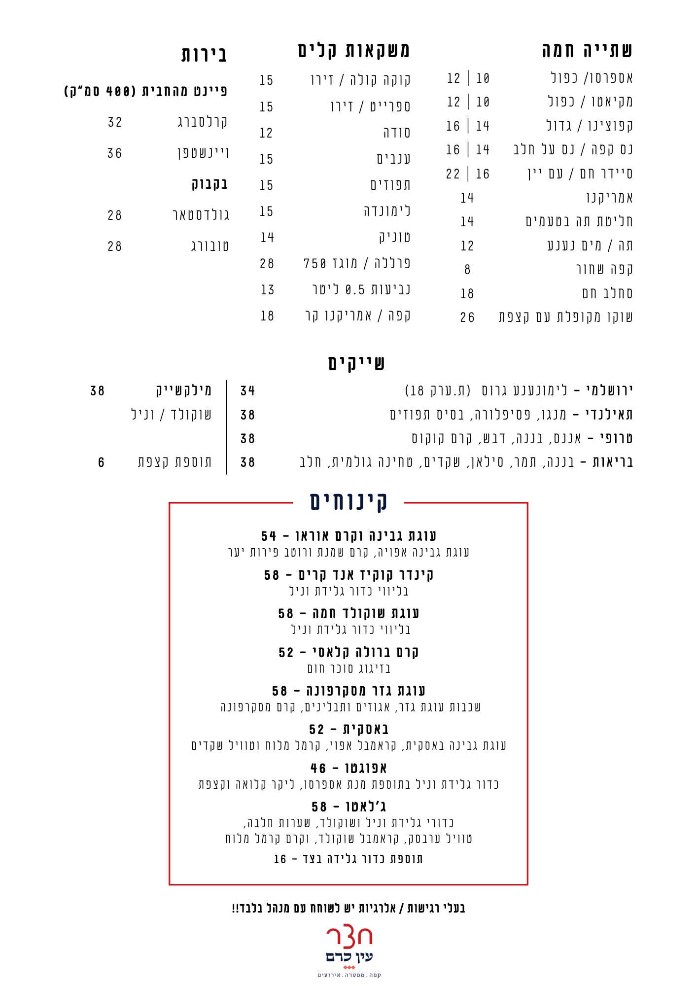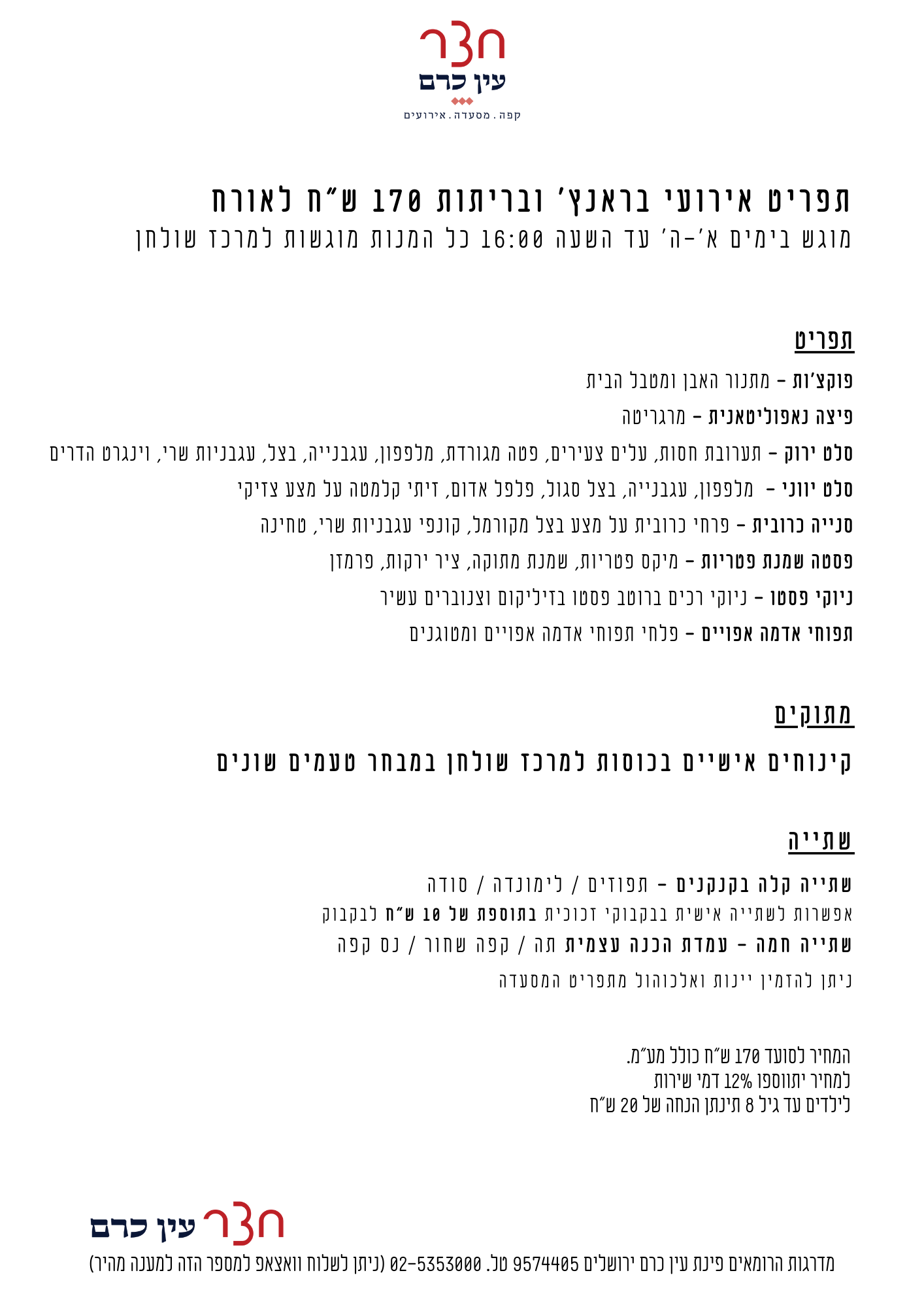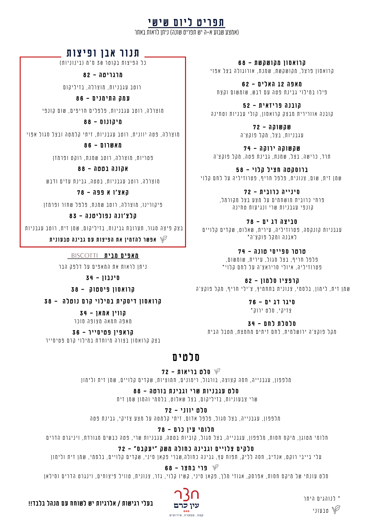 יש הרבה מנות ללא גלוטן בתפריט ותמיד אנחנו שמחים לעזור ולהתאים את התפריט במידת הצורך לאורח